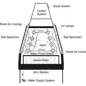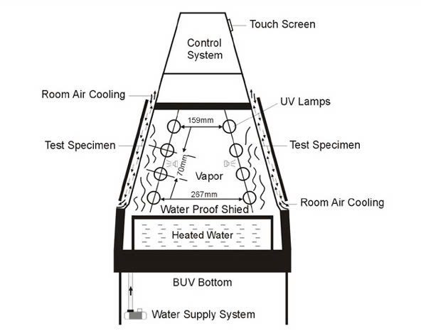 Đèn UV huỳnh quang có thể mô phỏng tác động của ánh nắng mặt trời, trong khi hệ thống phun nước và ngưng tụ có thể mô phỏng tác động của mưa và sương. Trong quá trình thử nghiệm, năng lượng bức xạ và nhiệt độ có thể kiểm soát được. Một chu kỳ thử nghiệm điển hình thường được thực hiện dưới sự chiếu xạ mạnh của tia UV hoặc trong khoảng thời gian ngưng tụ ẩm và tối với độ ẩm tương đối 100%. Các phép thử này thường được áp dụng trong các lĩnh vực sơn và chất phủ, công nghiệp ô tô, nhựa, gỗ, keo, v.v…
